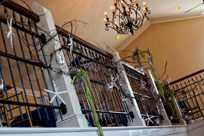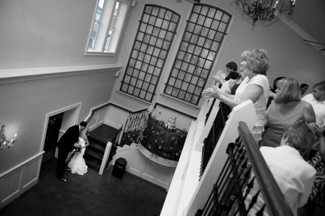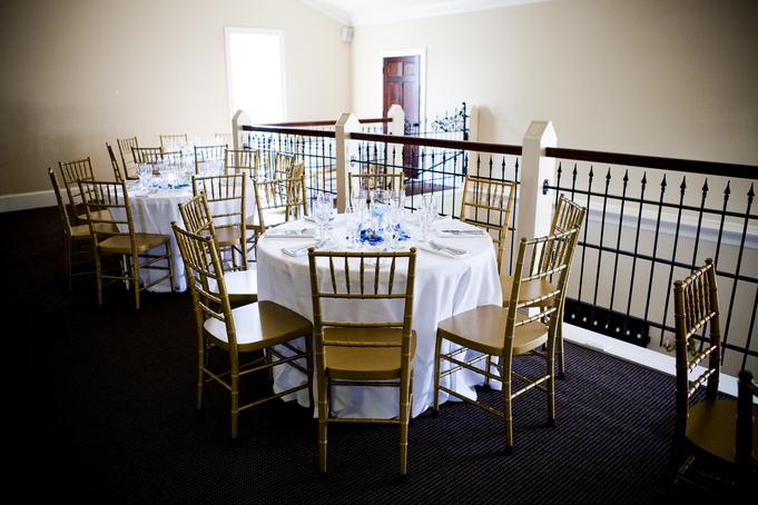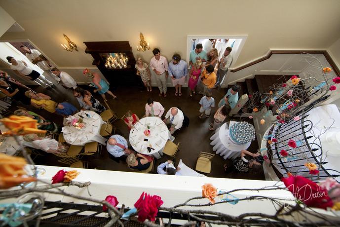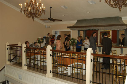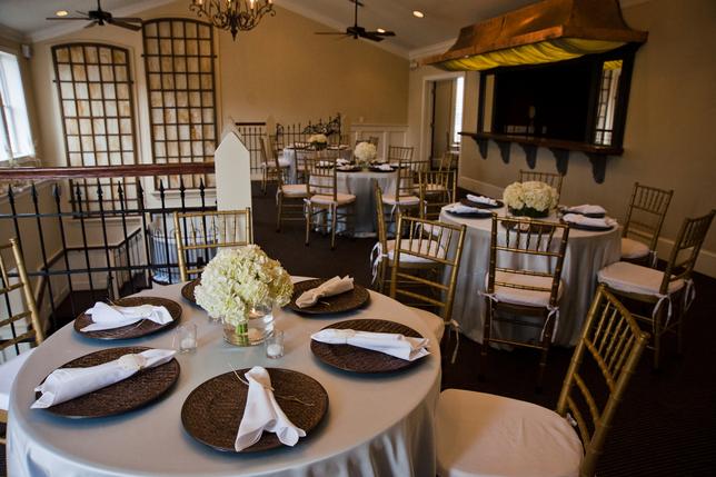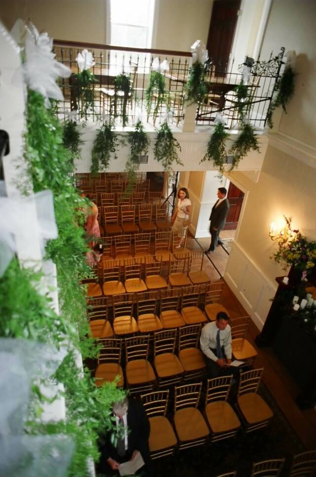 Upstairs is the second bar, featuring a copper top that was salvaged from the Carolinian Hotel. The bar opens to an L shaped room that overlooks the first ballroom creating the perfect place for a cocktail hour or dining.