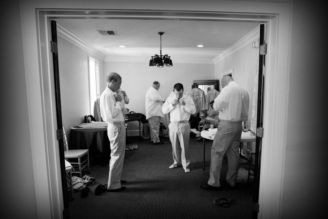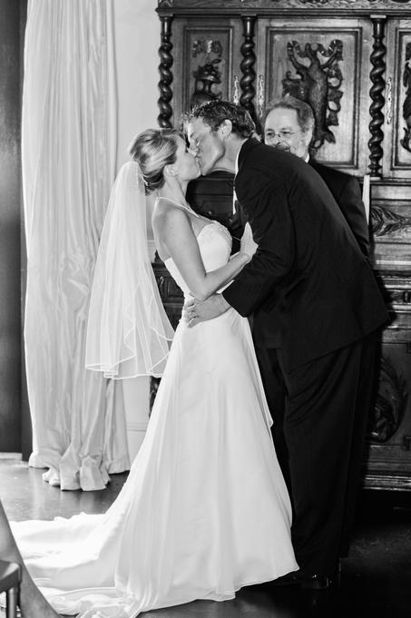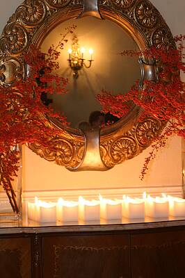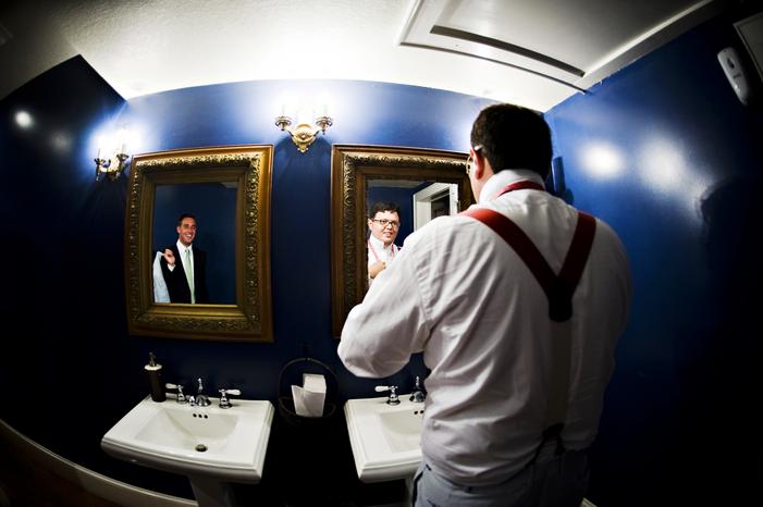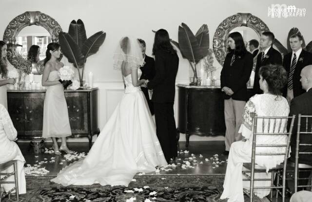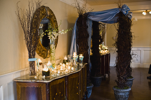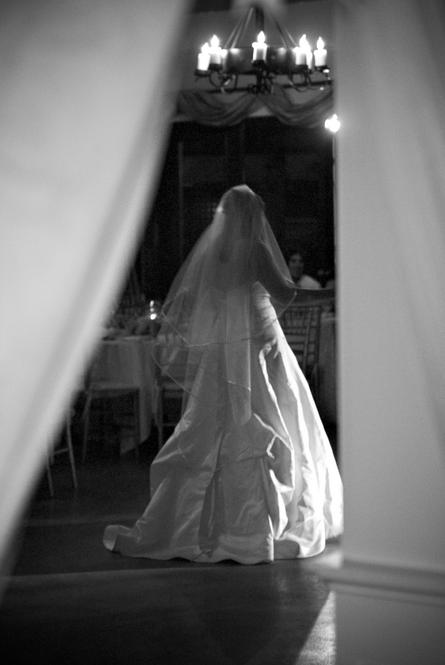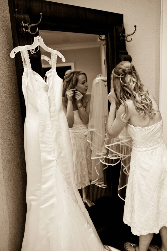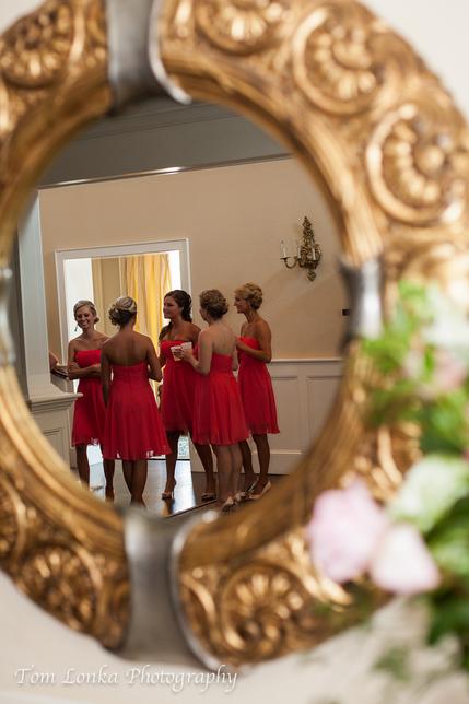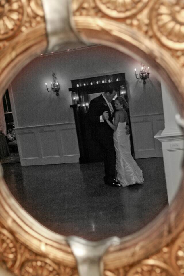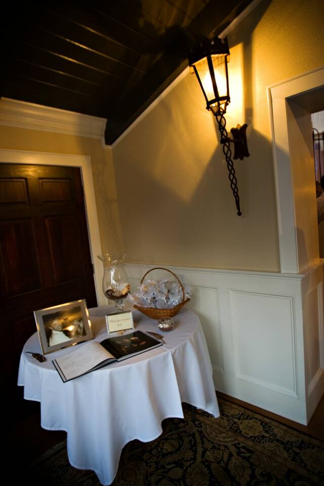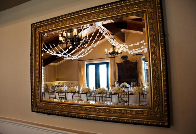 Double wood paneled doors open to another room. Some brides choose to dress for their big day in this room. An antique mirror offers the perfect reflection of you and is lovely in photographs.