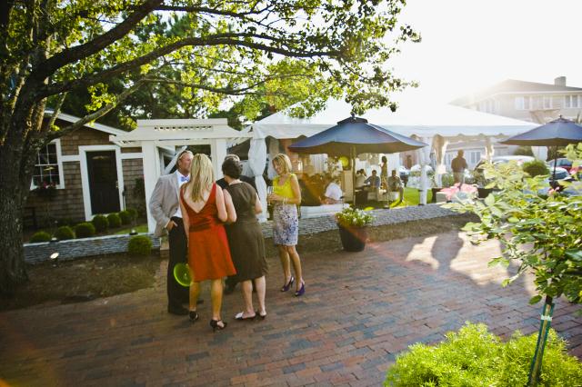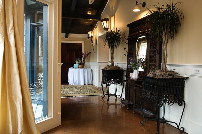 The Grand ballroom.... A large open floorplan allows for the flexibility for which 108 Budleigh is known. A perfect place for ceremony chairs, dining tables and/or a dance area (no need to rent a dance floor, Budleighs' floors are made for dancing.) Natural sunlight spills in through two sets of french doors that open onto a trellised veranda. Your bartender will enjoy the convenience of the downstairs bar which is complete with a three compartment sink, beautiful antique shelving and more. Next to the bar you will find a brick fireplace.